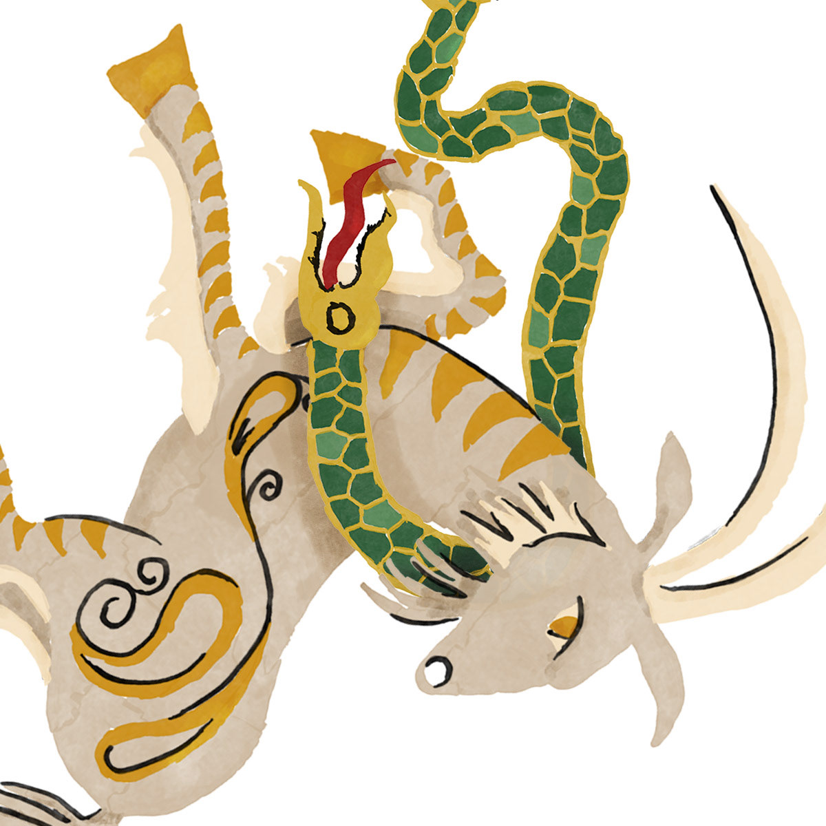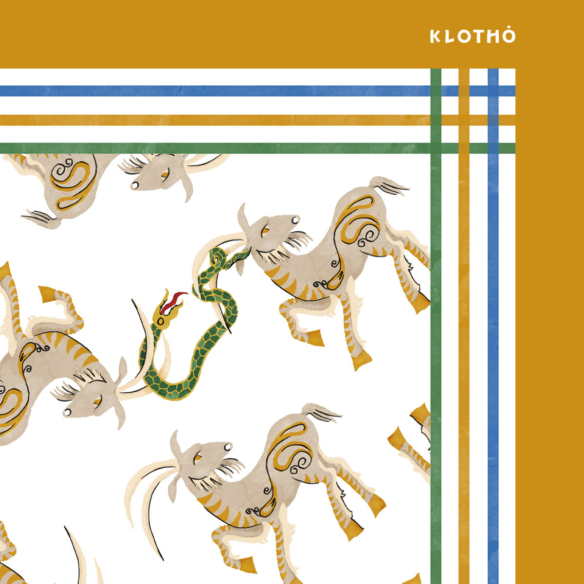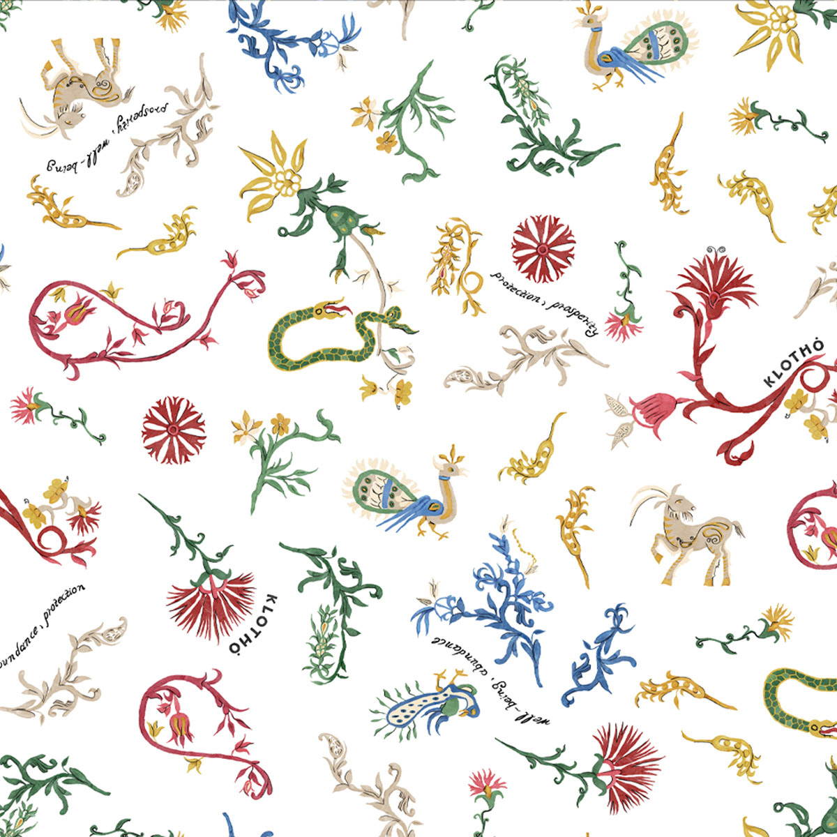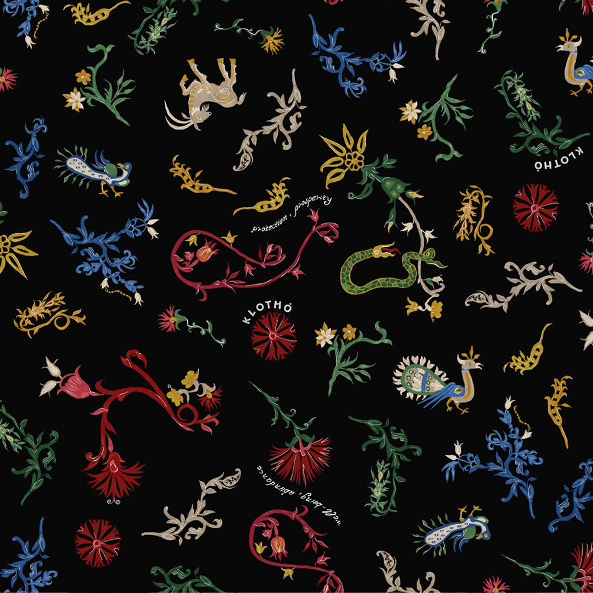 'Cretan Gaia' draws inspiration from the Cretan embroidery tradition of past centuries, where fabric functioned as a carrier of memory, symbols, and wishes. Scattered motifs – wild goats, peacocks, snakes, florals, and rosettes – coexist within a free, contemporary composition that preserves the core of this symbolic language: fertility, protection, and the continuous renewal of life.