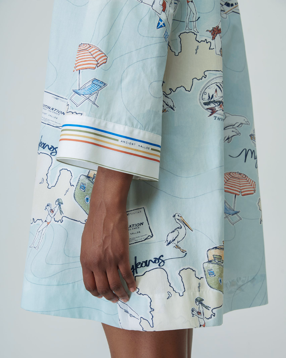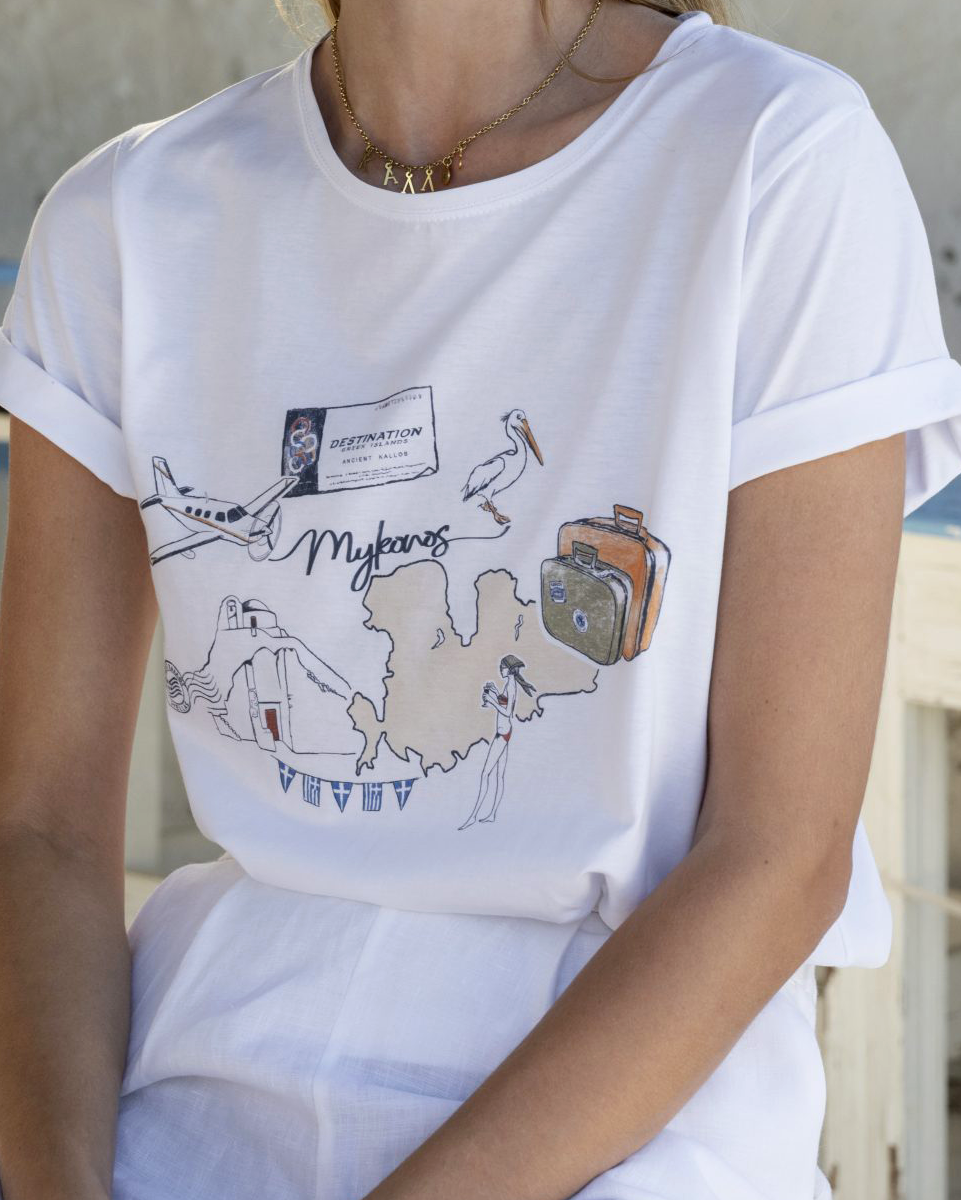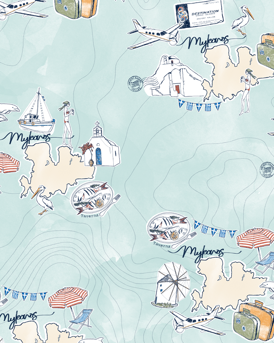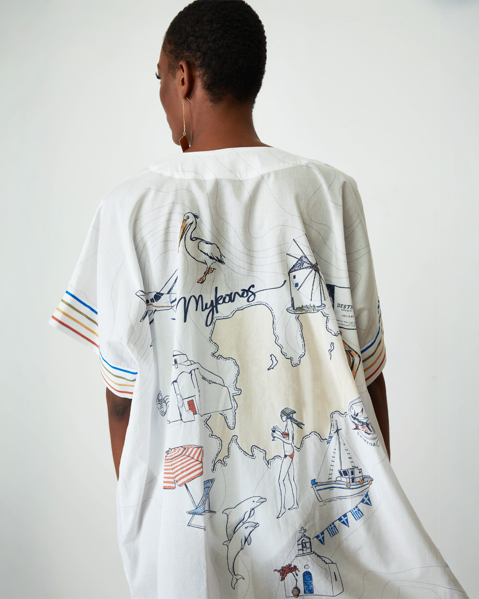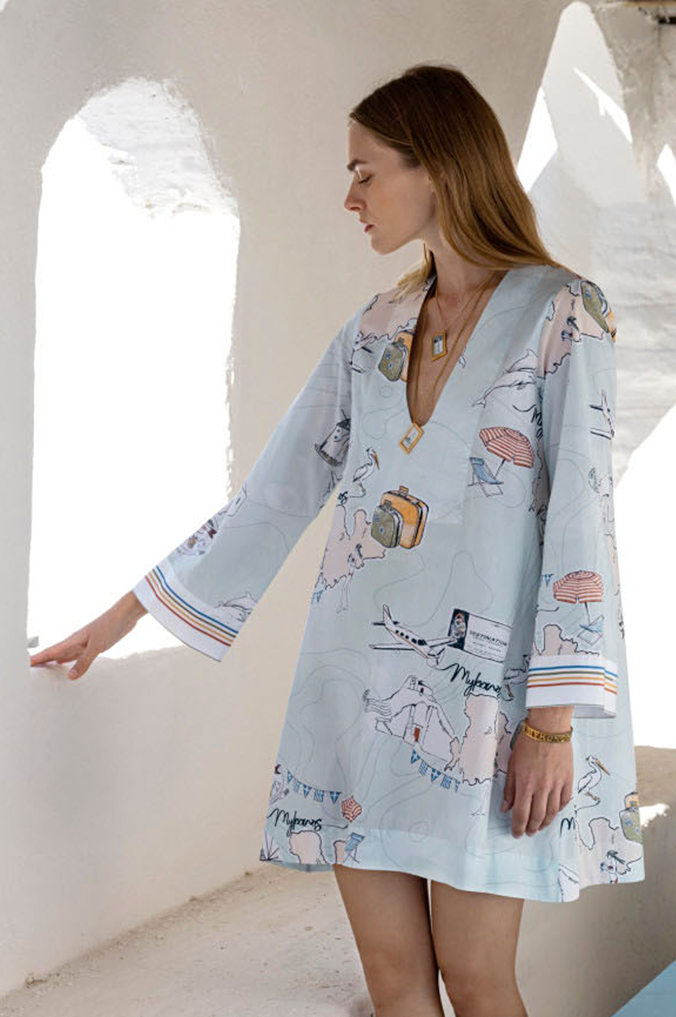 Το print 'Mykonos' αποτίει φόρο τιμής στο εμβληματικό καλοκαίρι της Μυκόνου της δεκαετίας του ’70, τότε που το νησί διατηρούσε ακόμη την αυθεντική, ανεπιτήδευτη γοητεία του. Μια εποχή που ανέδειξε τη Μύκονο σε αγαπημένο προορισμό των κοσμοπολιτών, διαμορφώνοντας τη χαρακτηριστική grecian chic ατμόσφαιρά της.