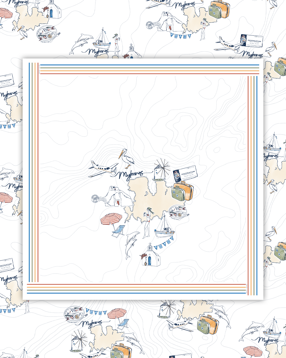 The 'Mykonos' print pays tribute to the iconic summer of Mykonos in the 1970s, when the island still retained its authentic, unspoiled charm. It was the era that established Mykonos as a favored destination of cosmopolitan travelers, shaping its distinctive grecian chic atmosphere.